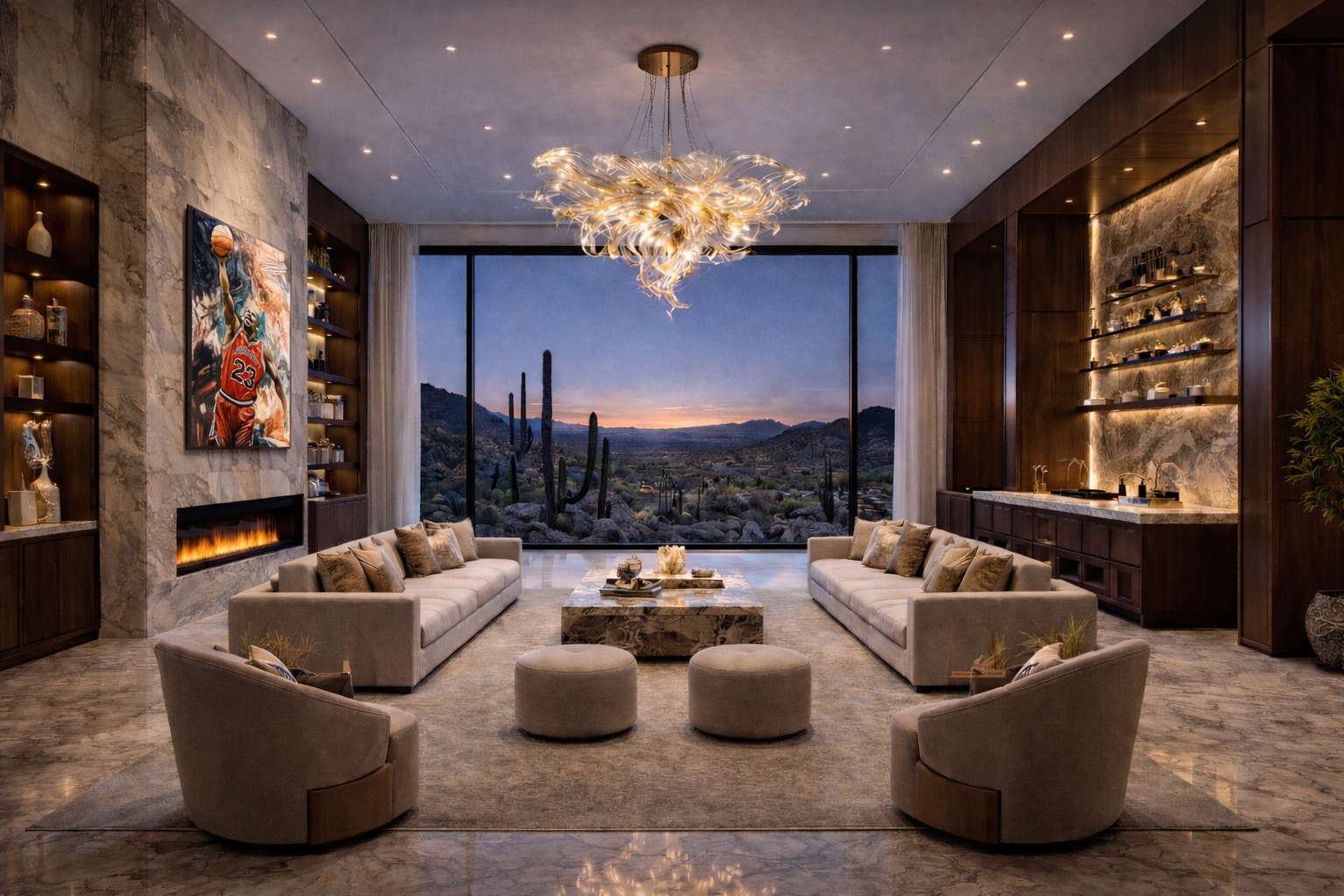 Key requests included expansive, open-concept rooms with tall ceilings, panoramic views, and strong focal points such as sculptural glass chandeliers, large-format televisions, and statement furniture. The client favored unique lighting designs inspired by organic forms, desert elements, and abstract glass sculptures, with an emphasis on realism, translucency, and refined opulence.